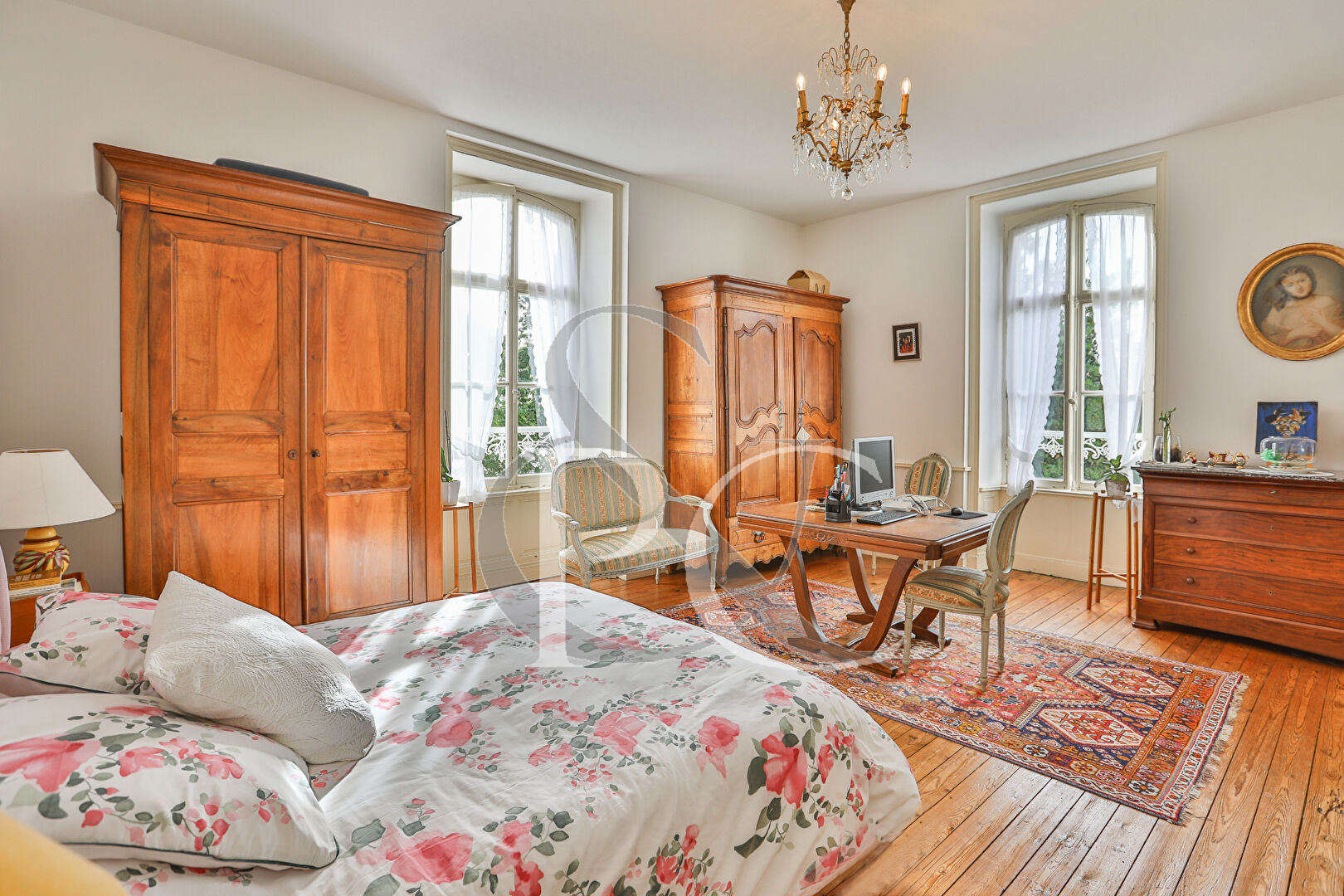 Souveraine dans son parc de plus de 8 000 m² entièrement clos, elle célèbre la vie de famille nombreuse, composée de 3 niveaux, avec ses 8 chambres, réparties sur les 2 étages supérieurs, au rez de chaussée : un salon, une salle à manger, une cuisine avec cheminée, un bureau, 3 salles d’eau et sa piscine chauffée avec pool house et cuisine d’été, promesses de moments radieux dans l’intimité de ce havre bucolique aux arbres remarquables. A l’arrivée de l’automne, un tapis de cyclamens ajoute sa touche de pastel rosé à ce tableau idyllique.