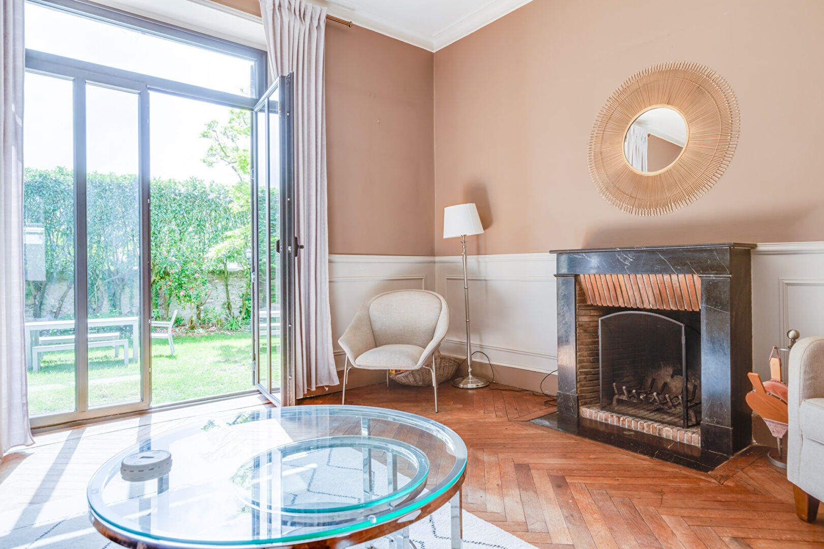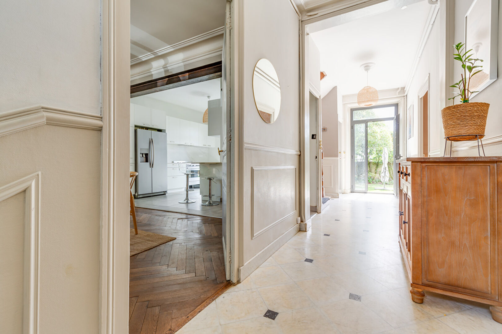 En RDC, l’entrée vous invite directement au jardin ou aux réceptions traversantes avec leur cheminée ; belle hauteur sous plafond, parquet chêne, rosaces…