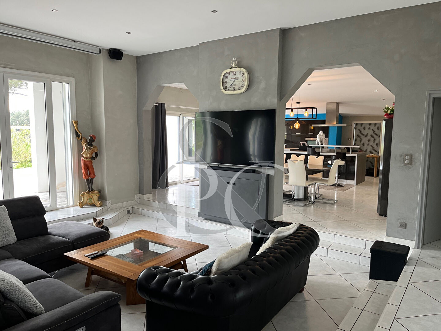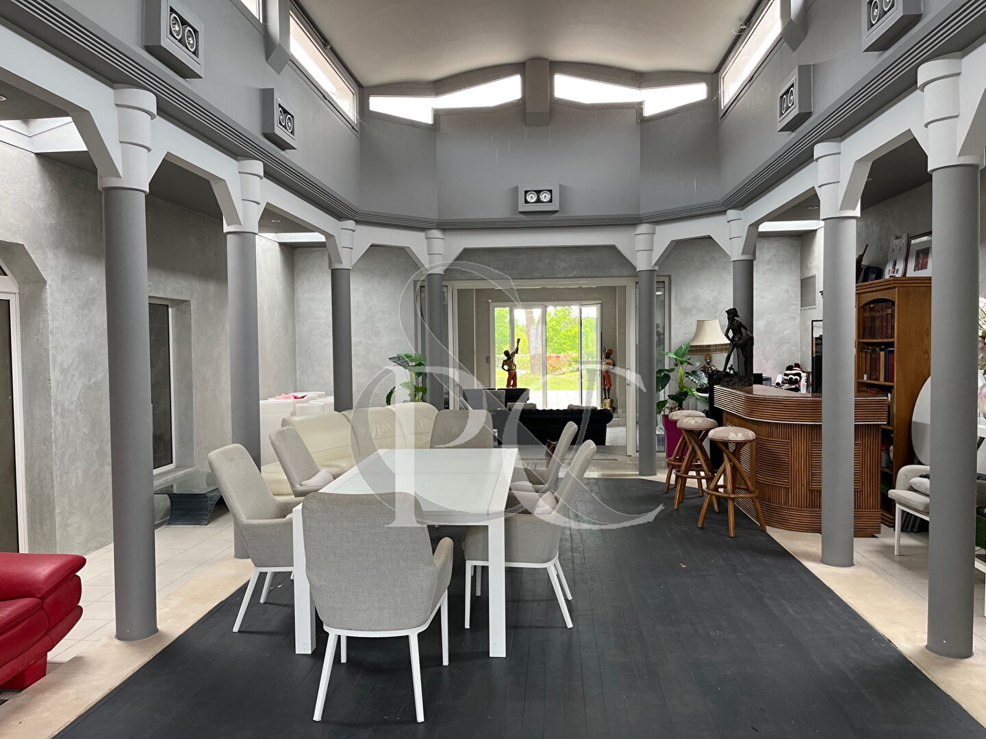 Au coeur d’un parc paysager avec un plan d’eau et terrain de tennis, cette maison d’architecte offre de superbes volumes.