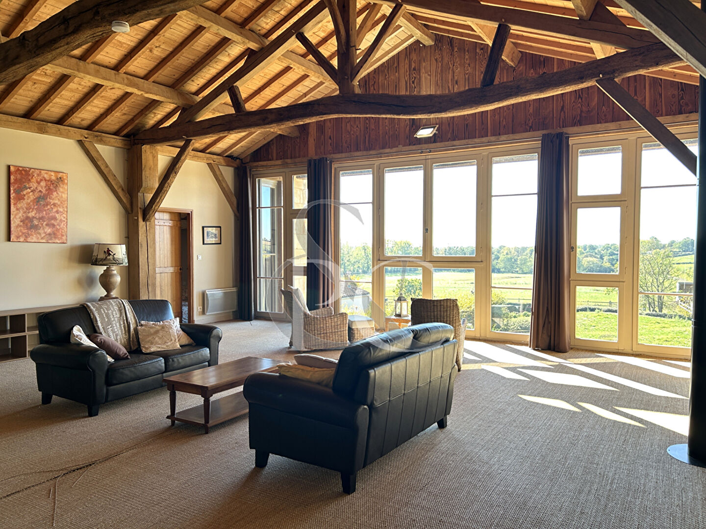 Cinq belles chambres, dont une suite de plain-pied, bureaux et chauffage air/eau; un espace de réception aux normes PMR, installations équestres (grange, appentis et stabulation), prés, piscine et parking multi-places.