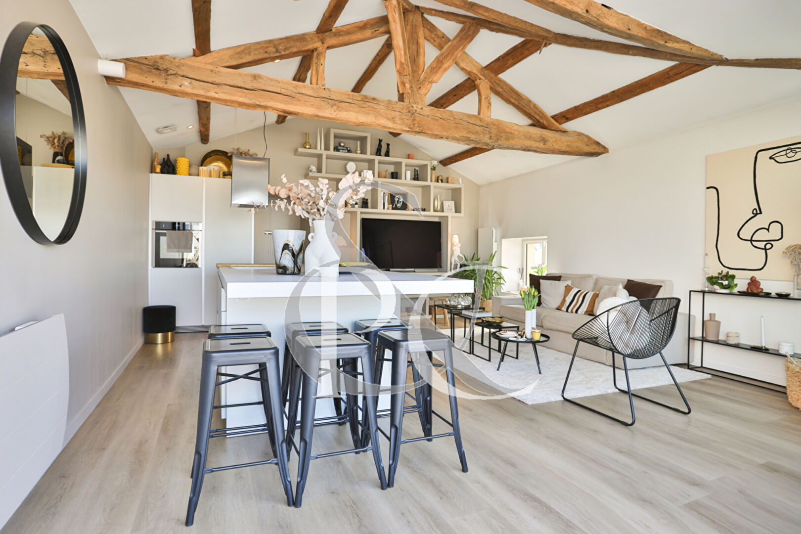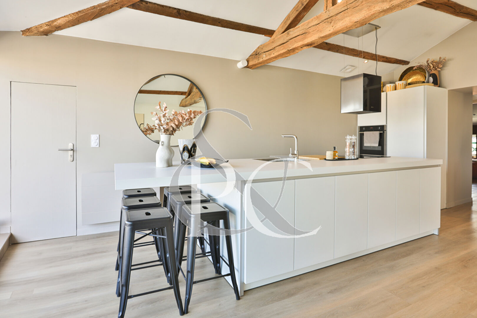 Dès l’entrée, la pièce de vie capte la lumière et révèle de belles poutres apparentes, apportant caractère et élégance dans un esprit contemporain. La cuisine équipée s’intègre parfaitement à l’ensemble et s’ouvre sur la terrasse, créant une vraie continuité avec l’extérieur.