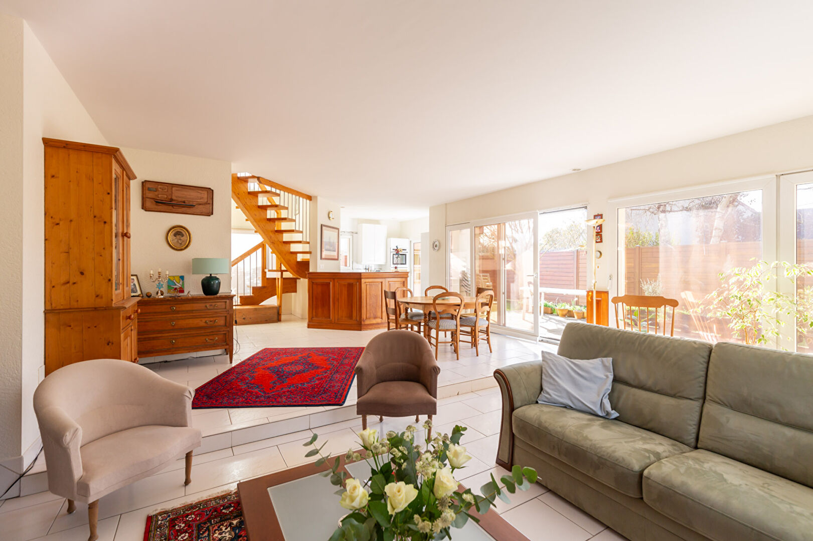 En RDC, le hall d’entrée vous invite dans le séjour ensoleillé d’environ 47 m² avec cheminée et de plain pied sur la terrasse et le jardin avec triple exposition (EST – SUD- SO) . La cuisine ouverte sur le séjour bénéficie également d’un accès direct sur le jardin.
